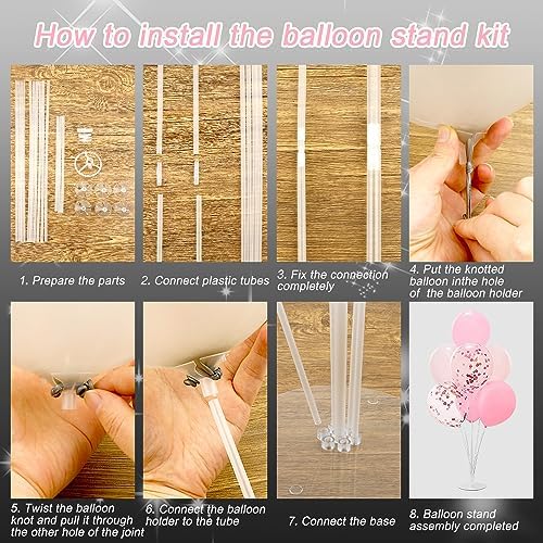 Easy Assembly: Connect plastic tubes, fix the connection completely. Then put the knotted balloon in the hole of the balloon holder, twist the balloon knot and pull it through the other hole of the joint. Finally, connect the balloon holder to the tube and connect the base.
