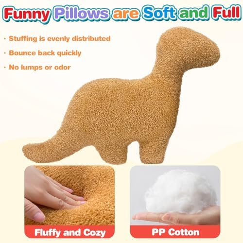Fun Throw Pillows Funny Decor: Dinosaur chicken nugget pillow is well made with excellent stitching. The neck, legs and pillow are full and not saggy or sparse of filling. Dinosaur throw pillow makes a great home decoration to thrown on the bed or couch, food stuffed animals plush novelty pillow is funny and a conversation starter.