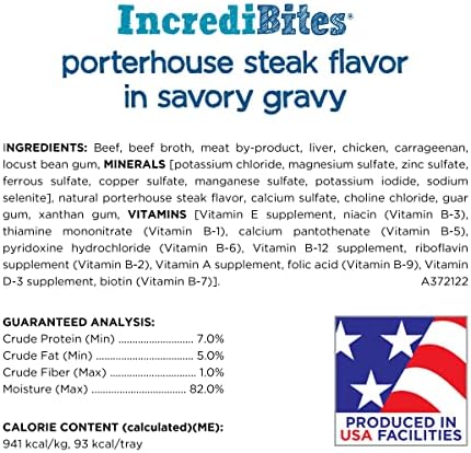 Answer the unique dietary needs of your lovable small breed dog with a flavorful serving of Beneful IncrediBites Pate Wet Small Breed Dog Food Porterhouse Steak Flavor in a Savory Gravy. This exciting small breed dog food is specifically formulated for adult small dogs with a protein-rich pate recipe featuring real beef as the number one ingredient to deliver 100 percent complete and balanced nutrition. This great tasting pate dog food is perfectly textured for small dog mouths to chew and will get your dog’s tail wagging every time you serve them up a convenient single-serve Beneful IncrediBites dog food tray. With no artificial preservatives, colors or flavors, this high protein dog food offers your lovable small breed dog everything they need and nothing they don’t. Show your small dog big love by indulging their big appetite for delicious natural dog food flavors with Purina Beneful IncrediBites adult dog food today.