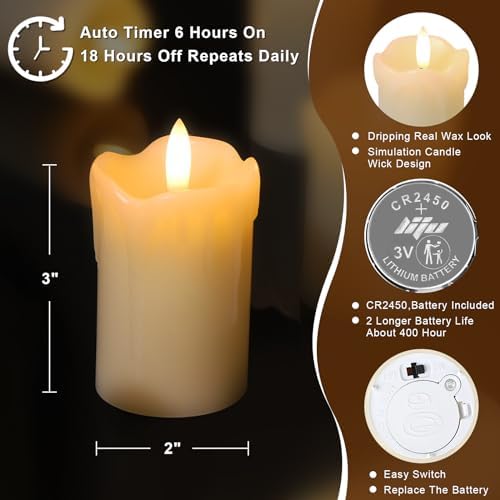 [ Made of Real Wax ] new 3D flameless pillar candles, each electric candle measures 2 x 3 inches. Melted edge design, real drip wax appearance, black wick, and simulated traditional burning candles flickering new 3D flameless. All this gives a more vivid and realistic appearance, instead of burning candles, which creates a soothing and relaxing ambiance