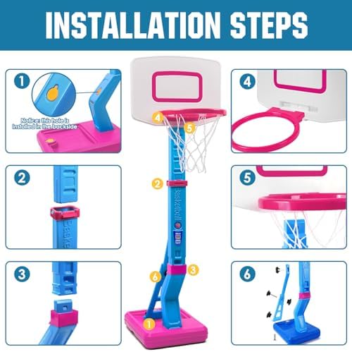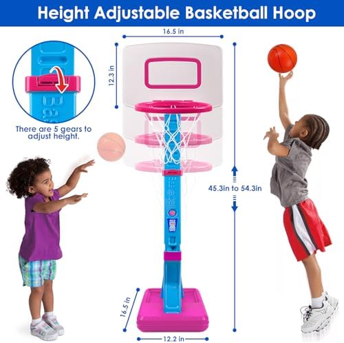 🏀ADJUSTABLE TODDLER BASKETBALL HOOP: There are 5 slots on the rod to adjust its height from 2.3 feet to 4.5 feet, which is great for growing kids over 3 years old. And you can put it low to increase his confidence when your baby wants to dunk on it, or put it high when he wants to shoot and practice his skills.