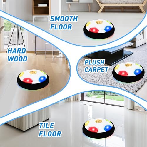 ⚽ ⚽ Moves On Hardwood Floor Easily – The light up soccer ball floats on it’s own air cushion, which helps it glide and rebound easily. All the material is very safe to touch. The soft & flexible foam edging can not only protect the kids from getting hurt but also to protect your furniture and others things from damaging.