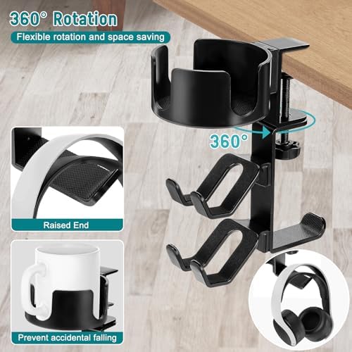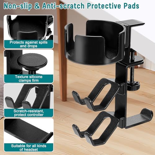 【4 in 1 Multifunctional Cup Holder】— The desk cup holder with controller holder and headphone holder allows to hold one cup or drinking bottle (under 3.74in diameter), two game controllers and one gaming or audio headset in one place, maximize your desktop space and keep your desktop neat and organized.