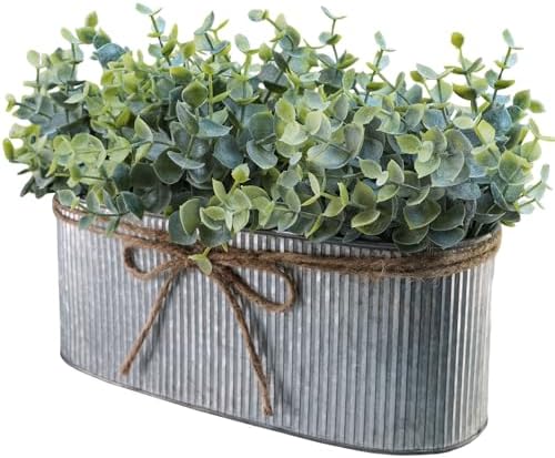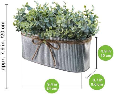 Color: The faux eucalyptus plants are in two-tone green with light dusting for a more realistic look. They are full and lush and look like a little eucalyptus bouquet. The oval galvanized metal planter box features ribbed detailing in a distressed vintage look and is tied with a jute twine for a rustic charm. This faux greenery arrangement will bring touch of fresh look to your decor. Perfect greenery centerpiece to decorate your home all year round!