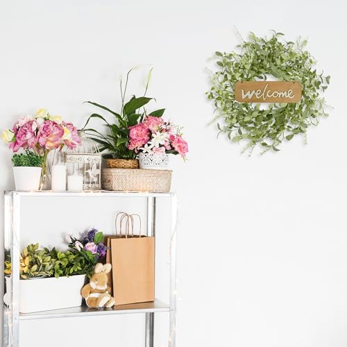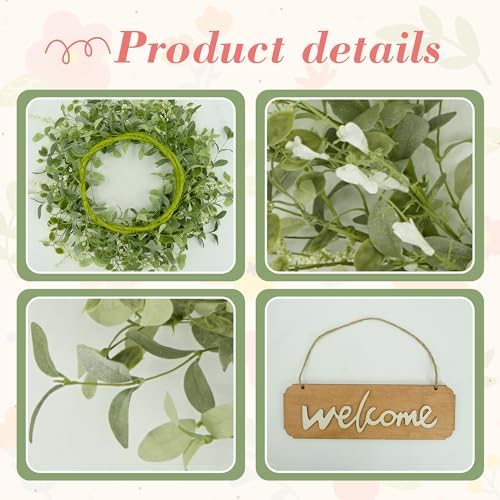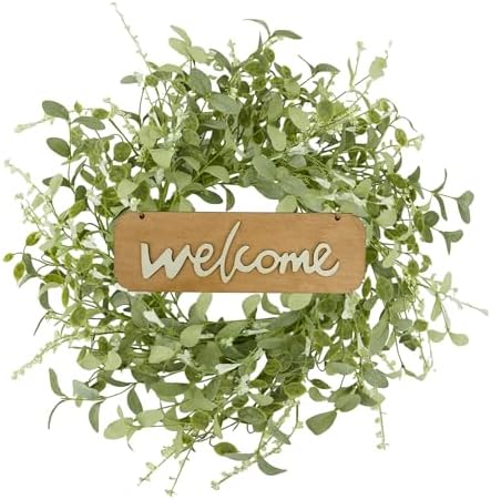 YNYLCHMX 18″ Spring Wreaths for Front Door with Welcome Sign Summer Wreath, Green Eucalyptus Leaves White Flowers, Artificial Wreath Green Foliage Wreath for Wall Window Farmhouse Party Holiday Home