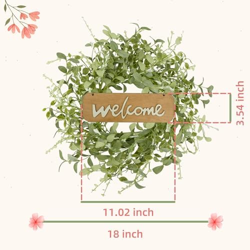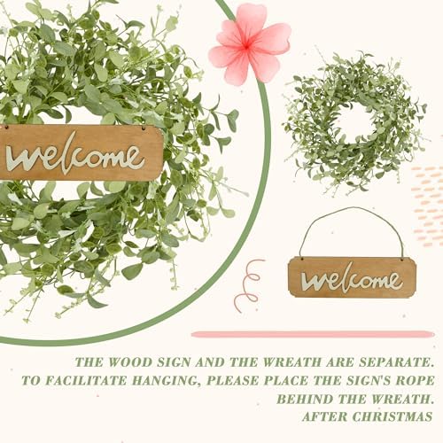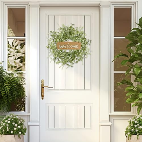 YNYLCHMX 18″ Spring Wreaths for Front Door with Welcome Sign Summer Wreath, Green Eucalyptus Leaves White Flowers, Artificial Wreath Green Foliage Wreath for Wall Window Farmhouse Party Holiday Home